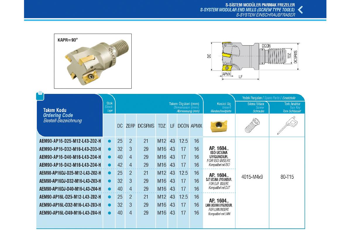 Характеристики товара: Сменная фрезерная головка с подачей СОЖ AEM90-AP16-D25-M12-L43-Z02-H под пластину APKT 1604.. AKKO