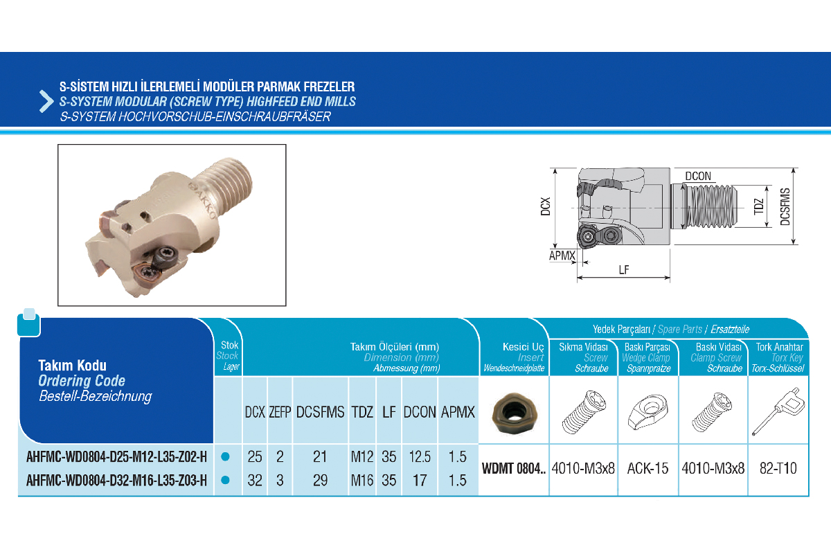 Характеристики товара: Сменная фрезерная головка с подачей СОЖ AHFMC-WD0804-D32-M16-L35-Z03-H под пластину WDMT 0804.. AKKO