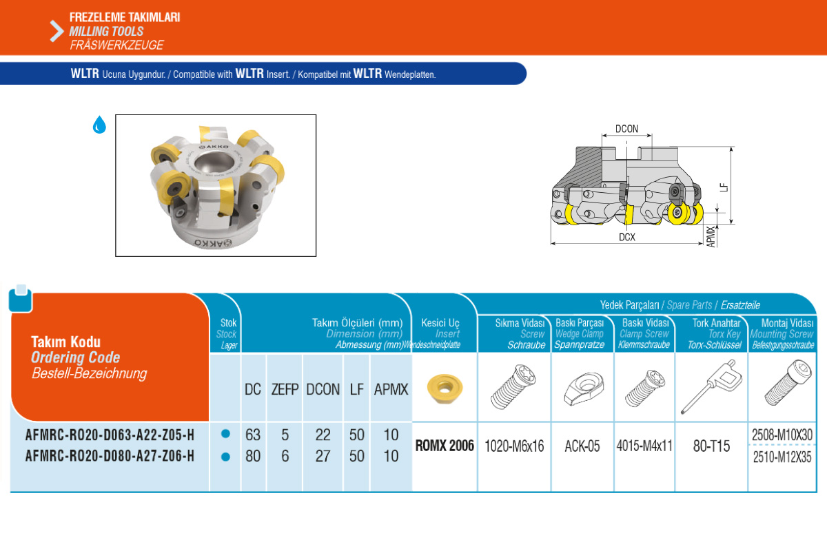Фреза торцевая насадная с подачей СОЖ AFMRC-RO20-D080-A27-Z06-H под пластину ROMX 2006.. AKKO