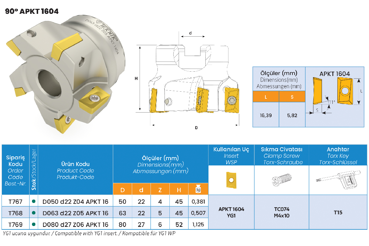 Характеристики товара: Фреза торцевая насадная T767 D050 d22 Z04 APKT 16 под пластину APKT 1604.. (YG1) TEKNIK