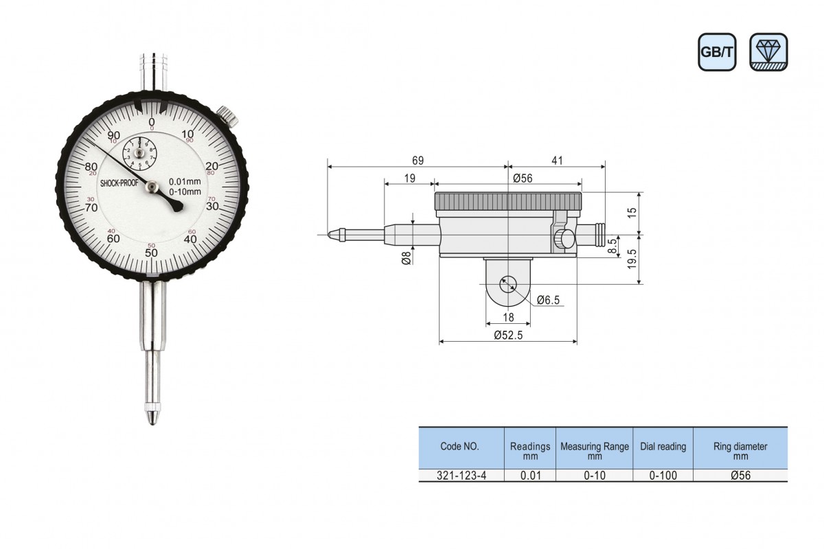 Описание товара: Индикатор часового типа ИЧ 0-10мм шкала 0.01мм с большим циферблатом 56мм и ушком GL