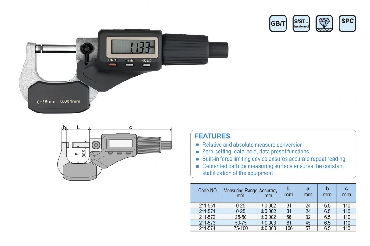 Описание товара: Микрометр гладкий цифровой МКЦ-50 25-50мм 0.001мм GL