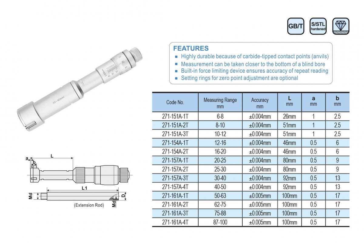 Нутромер микрометрический трехточечный НМТ 30-40мм шкала 0.005мм GL