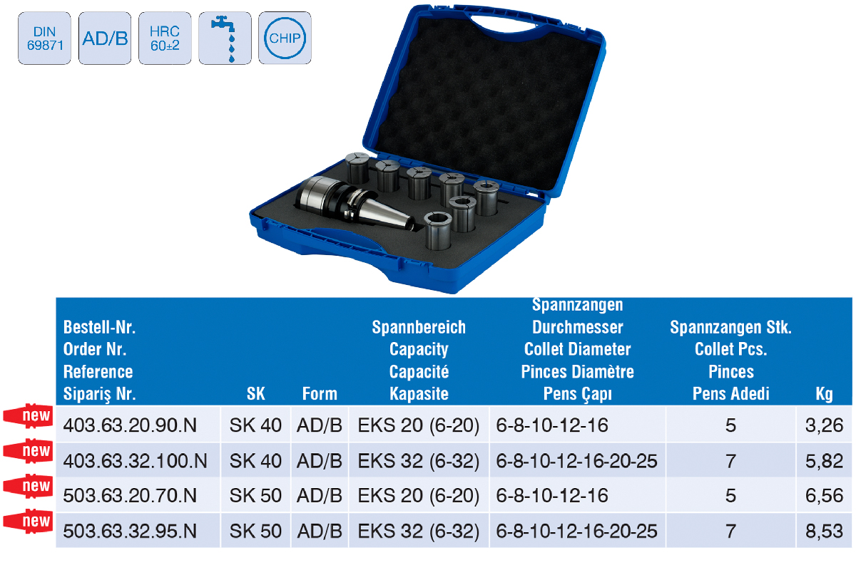 Описание товара: Набор цанг d6-8-10-12-16-20-25мм с силовым фрезерным патроном SK 40 с ключом 7ед. в кейсе EROGLU
