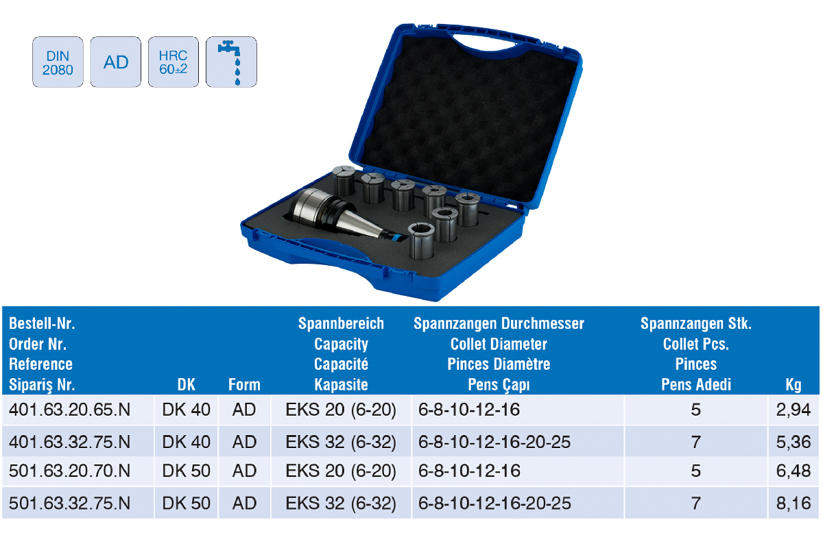 Описание товара: Набор цанг d6-8-10-12-16-20-25мм с силовым фрезерным патроном ISO 50 с ключом 7ед. у пл. чемодане EROGLU