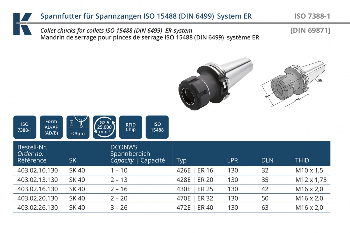 Характеристики товара: Патрон цанговый SK40 50x130мм к цангам ER32 2-20мм DIN69871 форма AD/B KEMMLER