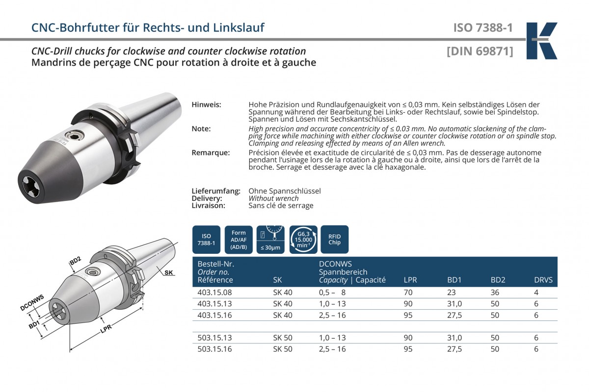 Характеристики товара: Патрон сверлильный SK50 для правого и левого вращения B16 1.5х95мм по DIN69871 форма AD KEMMLER