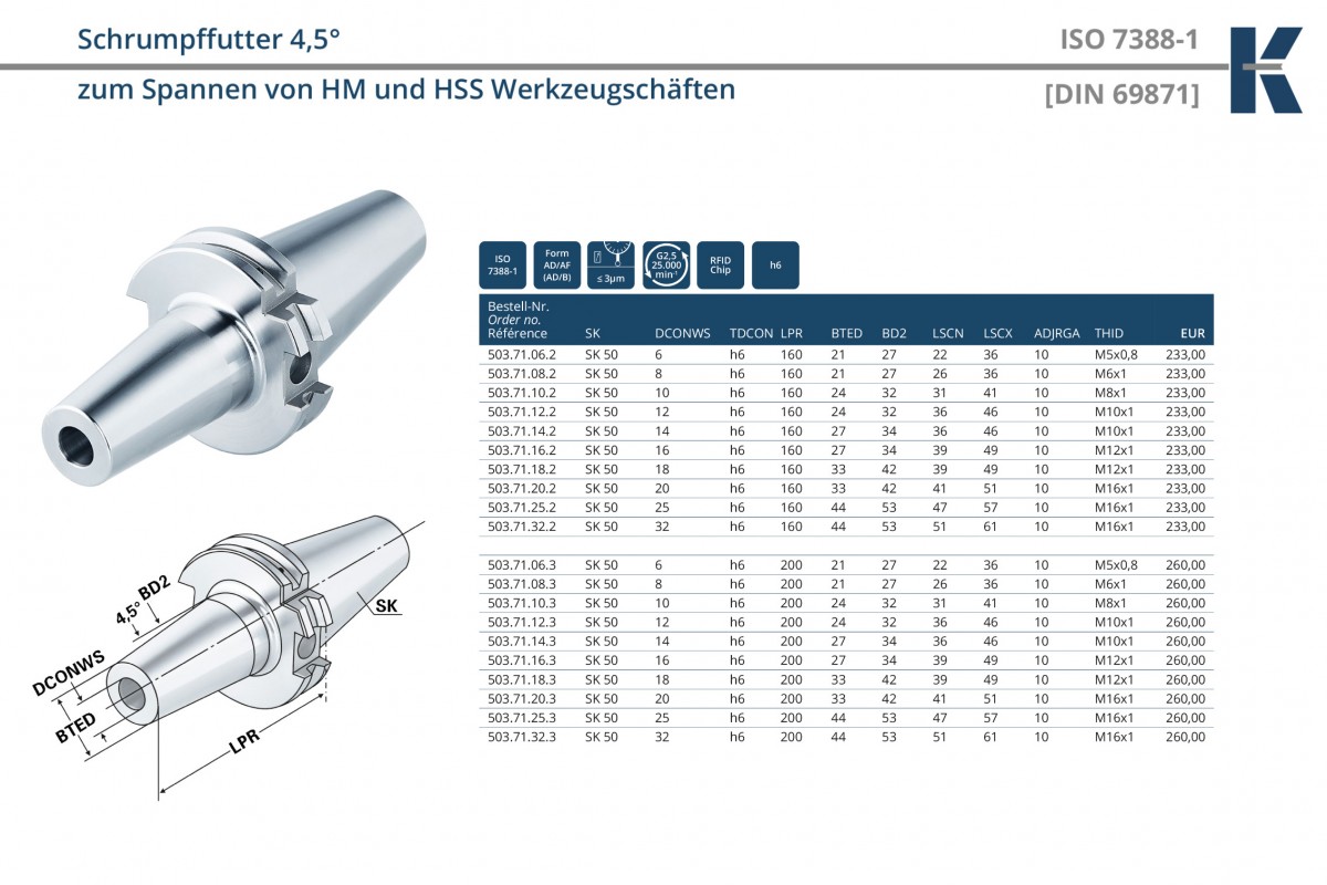 Характеристики товара: Термозажимной патрон SK50 20x200мм DIN69871 форма AD/B KEMMLER