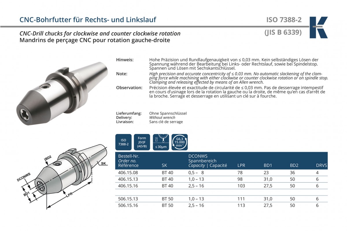 Описание товара: Патрон NC сверлильный BT50 для правого и левого вращения D50 1.5-16x113мм по MAS 403 BT форма AD KEMMLER