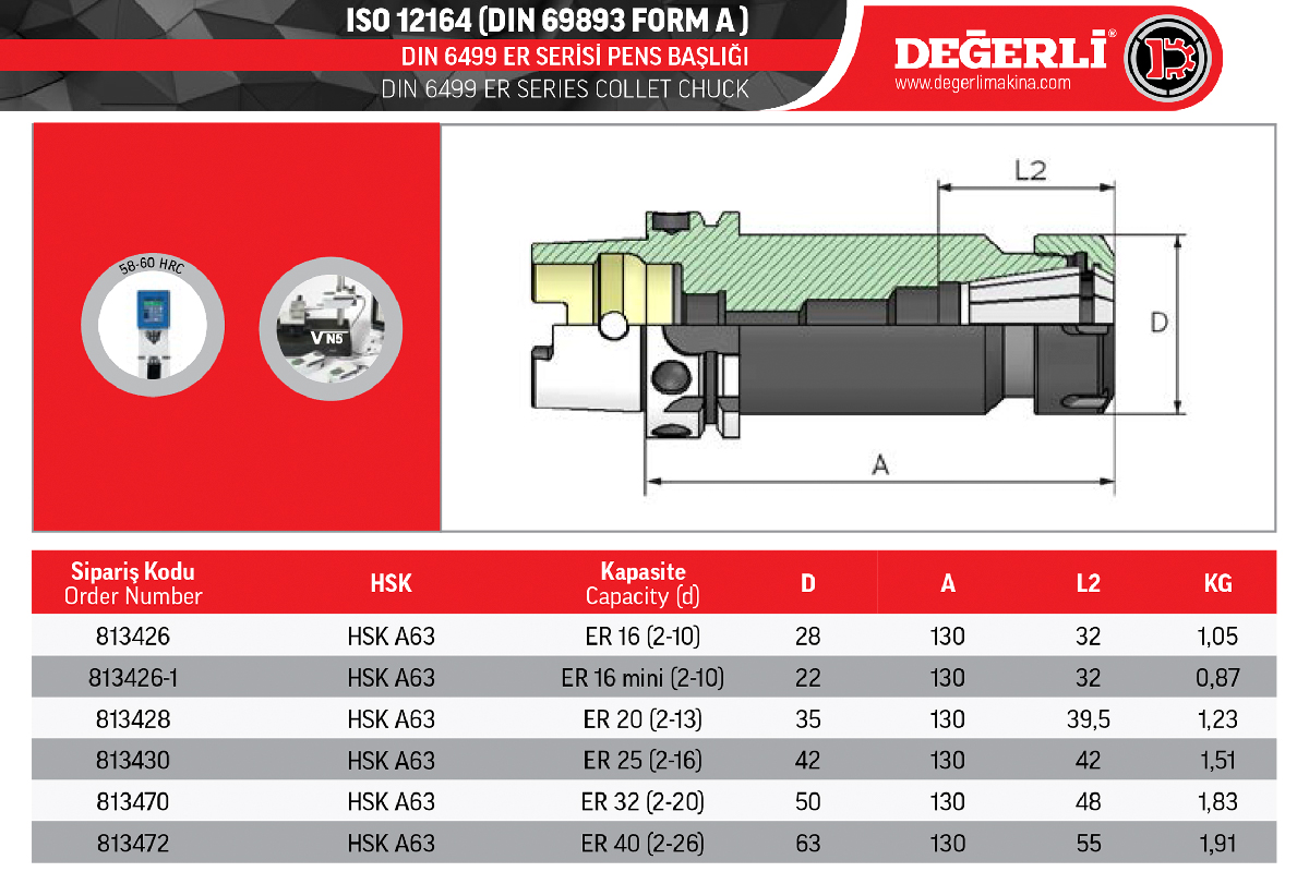 Характеристики товара: Патрон цанговый HSK-A 63 50x130мм к цангам ER32 2-20мм DIN69893-1 форма AD DEGERLI