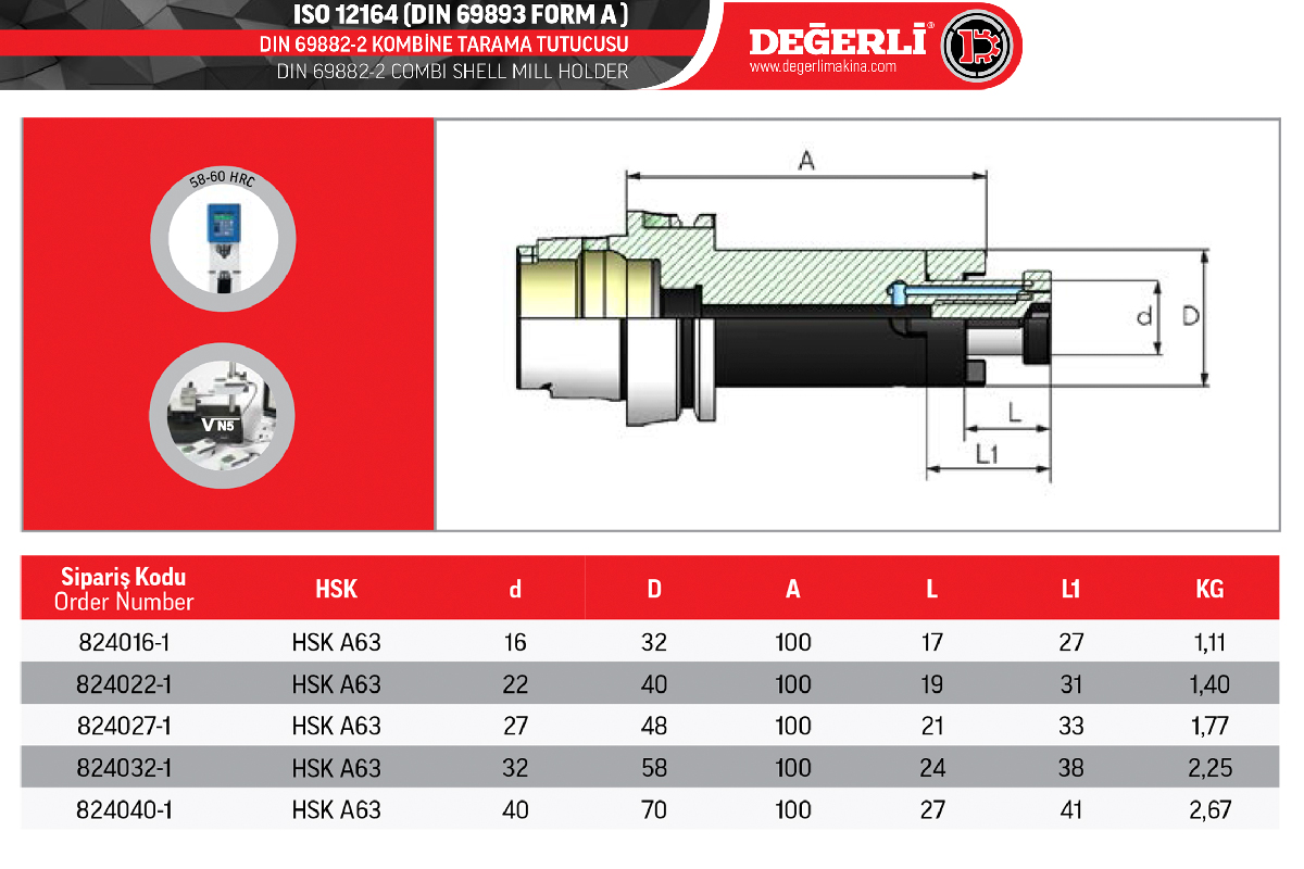 Характеристики товара: Оправка комбинированная HSK-A 63 для торцовых и дисковых фрез KTB 22х100мм DIN69893-1 форма AD DEGERLI