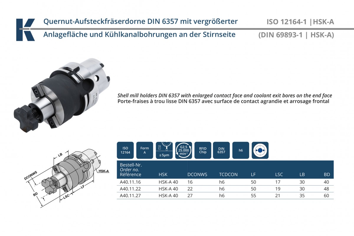 Характеристики товара: Оправка HSK-A 40 для насадных торцевых фрез ATB 22х50мм DIN69893 форма AD KEMMLER