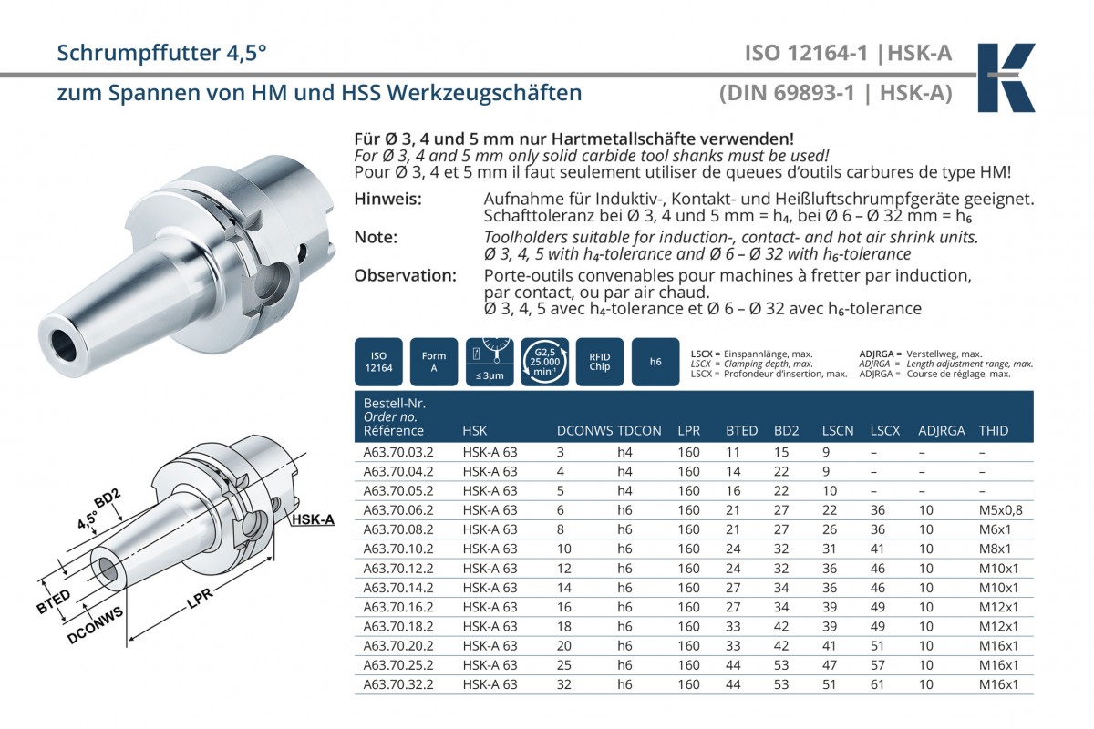 Характеристики товара: Термозажимной патрон HSK-A 63 25x160мм DIN69893-1 форма AD KEMMLER