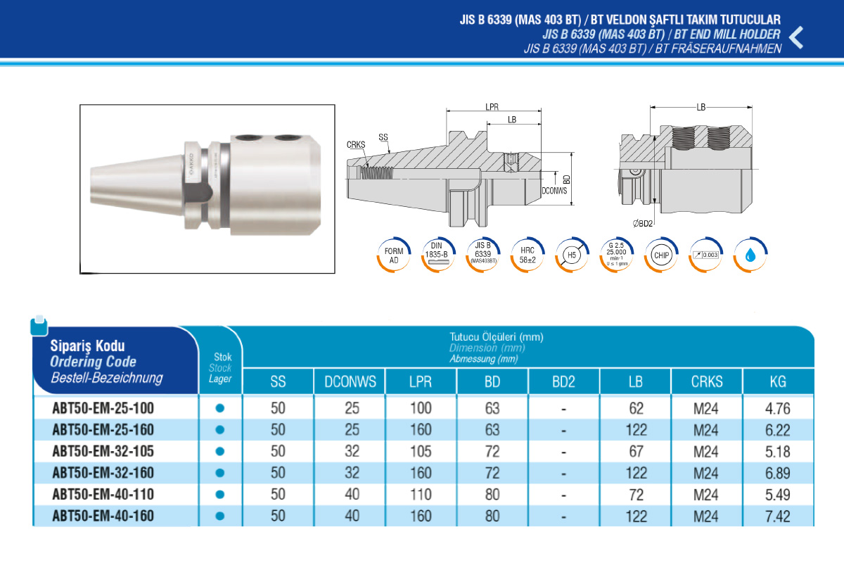 Характеристики товара: Оправка BT50 для инструмента с хвостовиком типа Weldon VT 25х100мм по MAS 403 BT форма AD AKKO