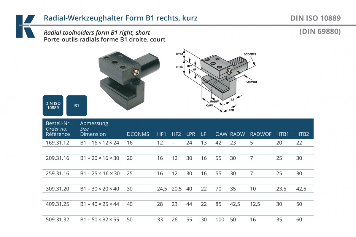 Резцедержатель VDI 16 радиальный короткий B1-16х12х24 правый DIN 69880 KEMMLER