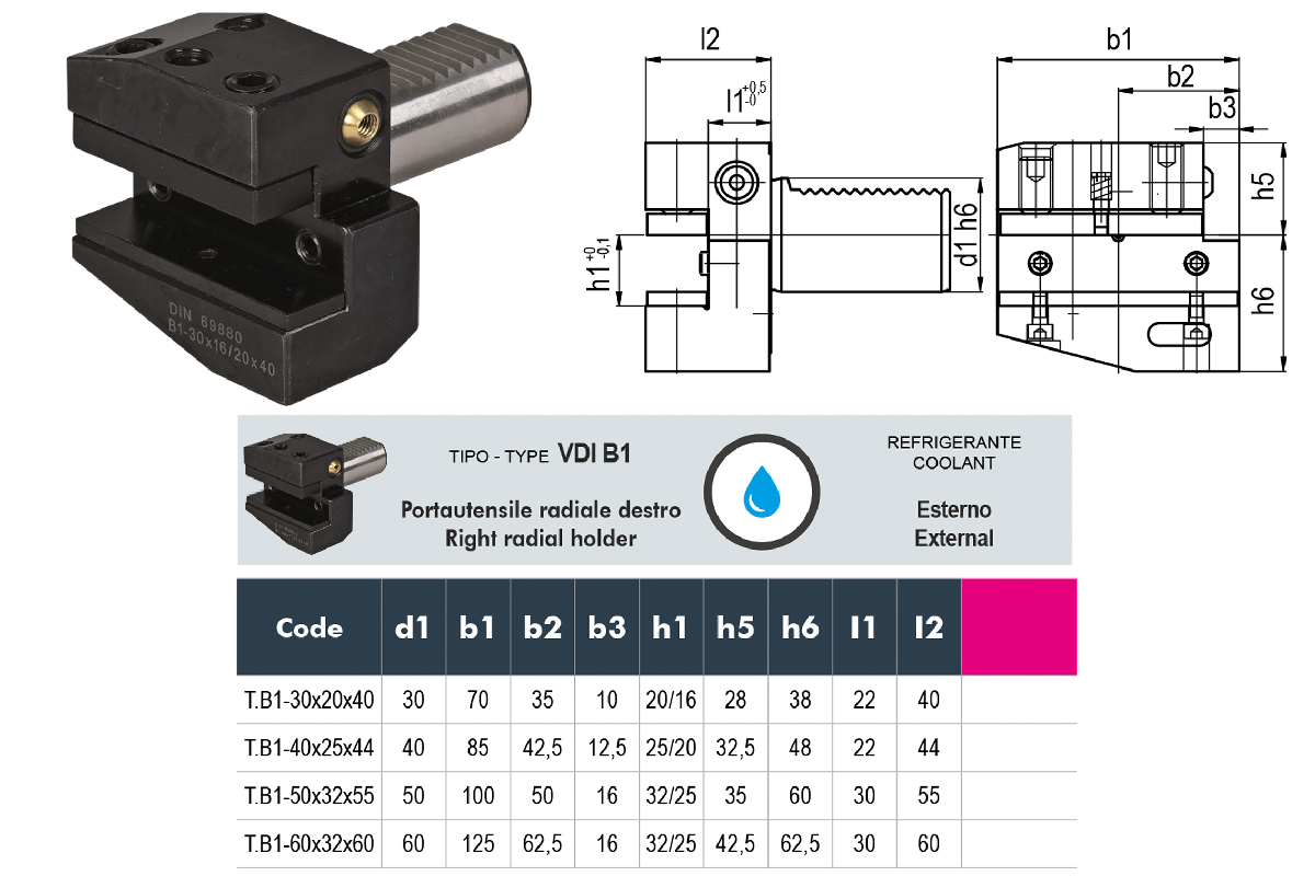 Характеристики товара: Резцедержатель VDI 3425 радиальный короткий B1-30х20х40 правый DIN 69880 GERARDI