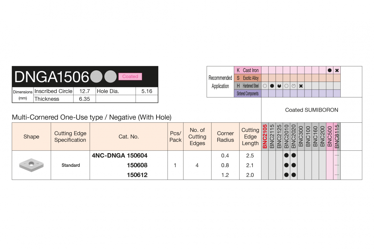 Характеристики товара: Твердосплавная пластина токарная с вставками CBN 4NC DNGA 150604 BNC200 SUMITOMO