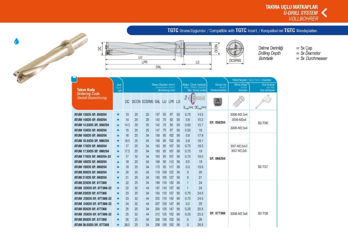 Характеристики товара: Свердло d26.5мм з охолодженням ATUM 26.5XD5 SP.. 07T308 під пластину SP.. 07T308 AKKO
