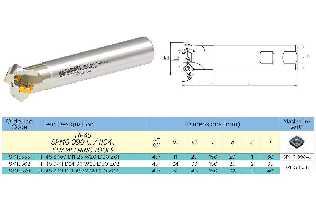 Описание товара: Фреза фасочная (зенковка) HF45 SP11 D24-38 W25 L150 Z02 под пластину SPMG 1104.. SMOXH